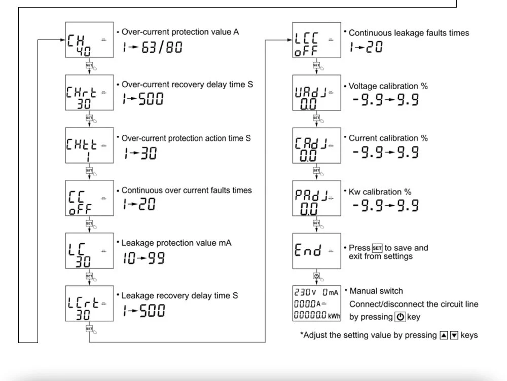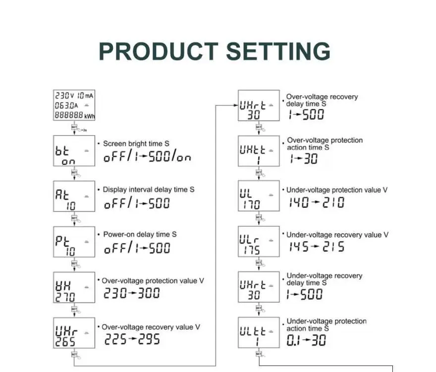 - 7.Over current protection 1A-63A (adjustable) (default: 40A)